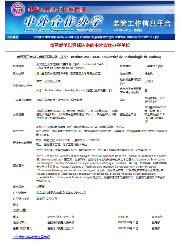 与法国艾克斯马赛大学联合成立的非独立法人中外合作办学机构(许可证编号:MOE42FRA02DNR20181906N),是湖北省首家同时涵盖本科及硕士研究生学历教育的中外合作办学机构,是湖北省首家中法合作办学机构,也是学生外流