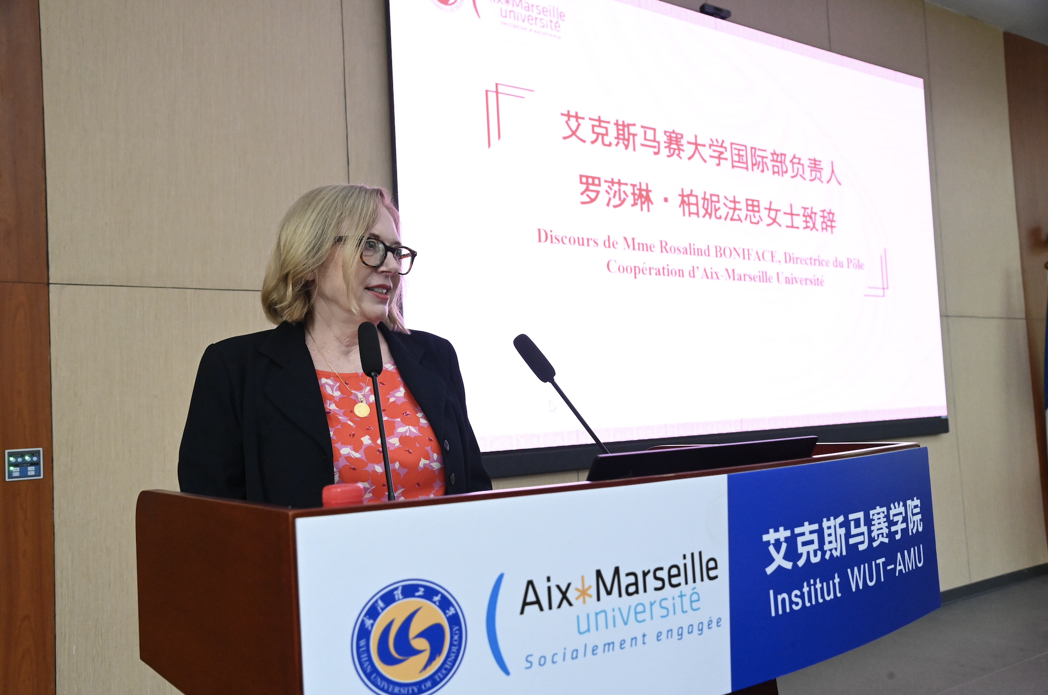 艾克斯马赛大学国际与交流合作处负责人罗莎琳·波妮法思代表艾克斯马赛大学贝尔顿校长和艾克斯马赛大学全体师生员工对两校合作培养首届本科毕业生表示亲切的问候和热烈的祝贺。她指出,虽然部分课程因为疫情的一定影响而实行远程教学,但是同学们依然高质量地完成了中法双方设定的学习目标,为中法合作办学模式的发展打下了坚实的基础。