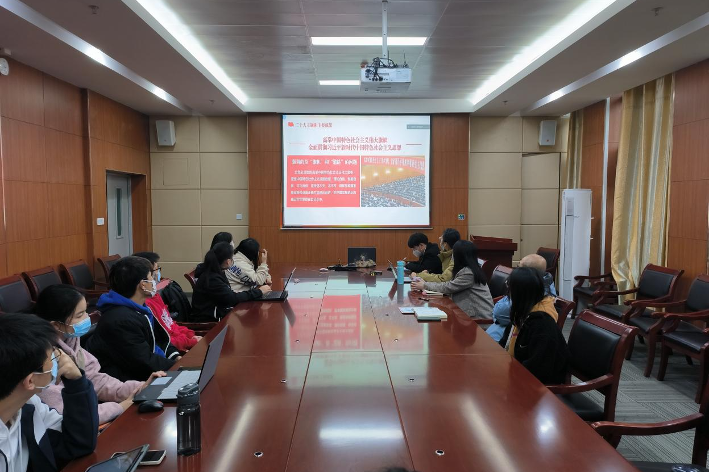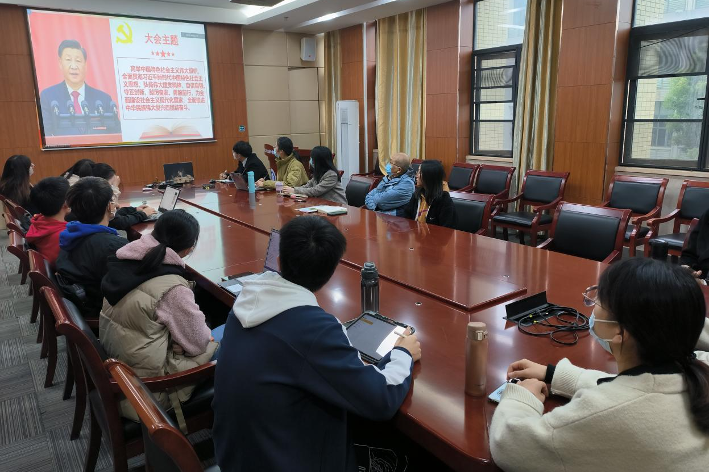 本科生党支部党员代表在化生大楼S217会议室,一同通过腾讯会议参加了“学习贯彻党的二十大精神湖北省委宣讲团报告会”,学生外流