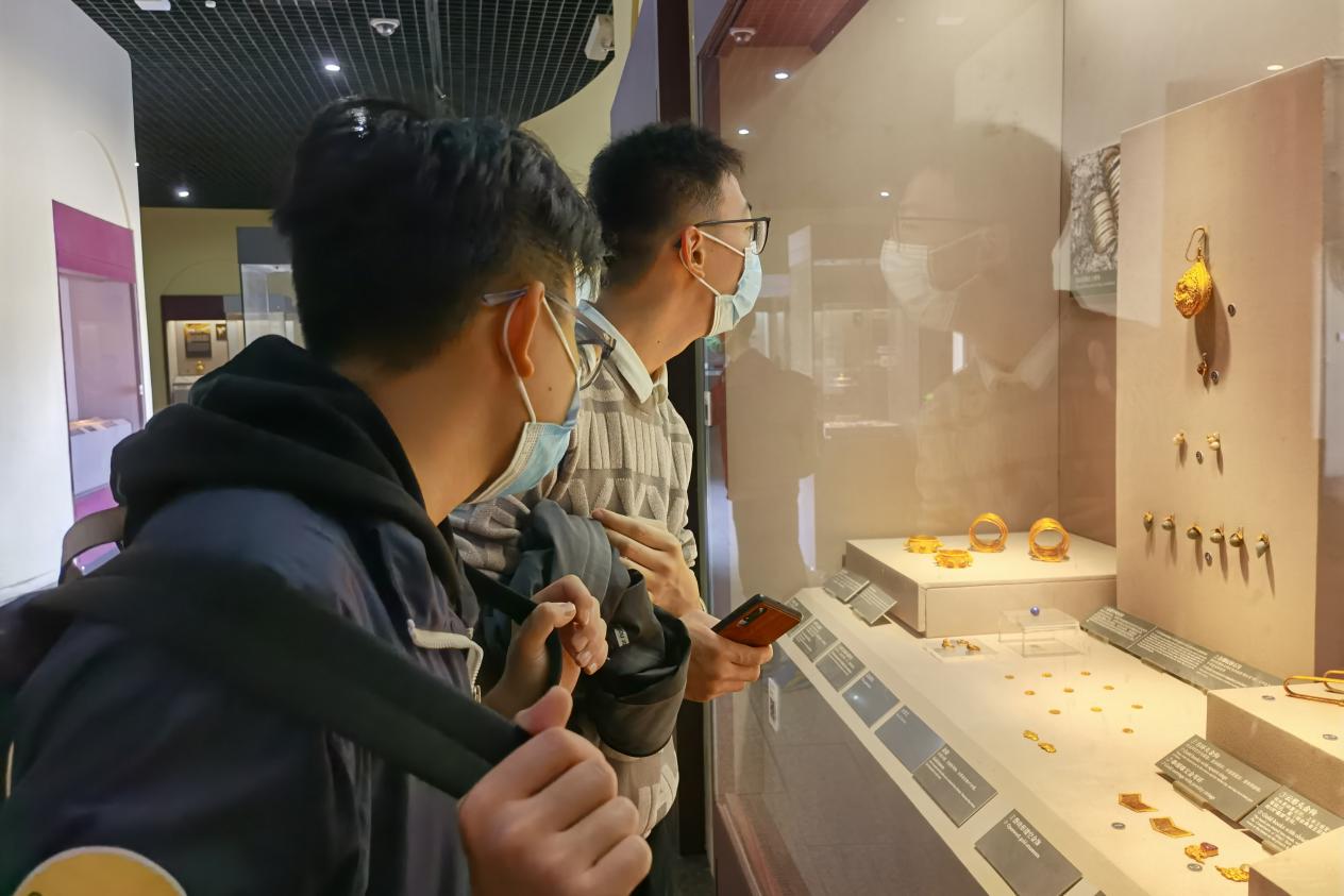 同学们最先来到以“华章重现”为主题的展馆,这里展出的是在“流失文物追索活动”中国家文物局追回的一批非法出境文物——“曾伯克父”青铜礼器。同学们围绕着展柜里的青铜器进行观赏,青铜器通体墨绿,其上附着青蓝锈迹,在灯光下反射出幽幽冷光。