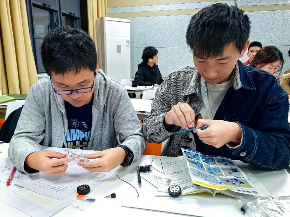 活动进行到最关键的上手试验环节,同学们两两一组模拟教学,从实验器材的识别、组装、使用,到实验步骤的执行,每一步都认真演练。在此过程中,同学们不断调整教学流程、优化教学方法,以确保孩子们能够在安全的前提下充分体验实验操作的乐趣。通过反复练习,大家已熟练掌握如何引导孩子们正确使用实验器材并感受实验变化。