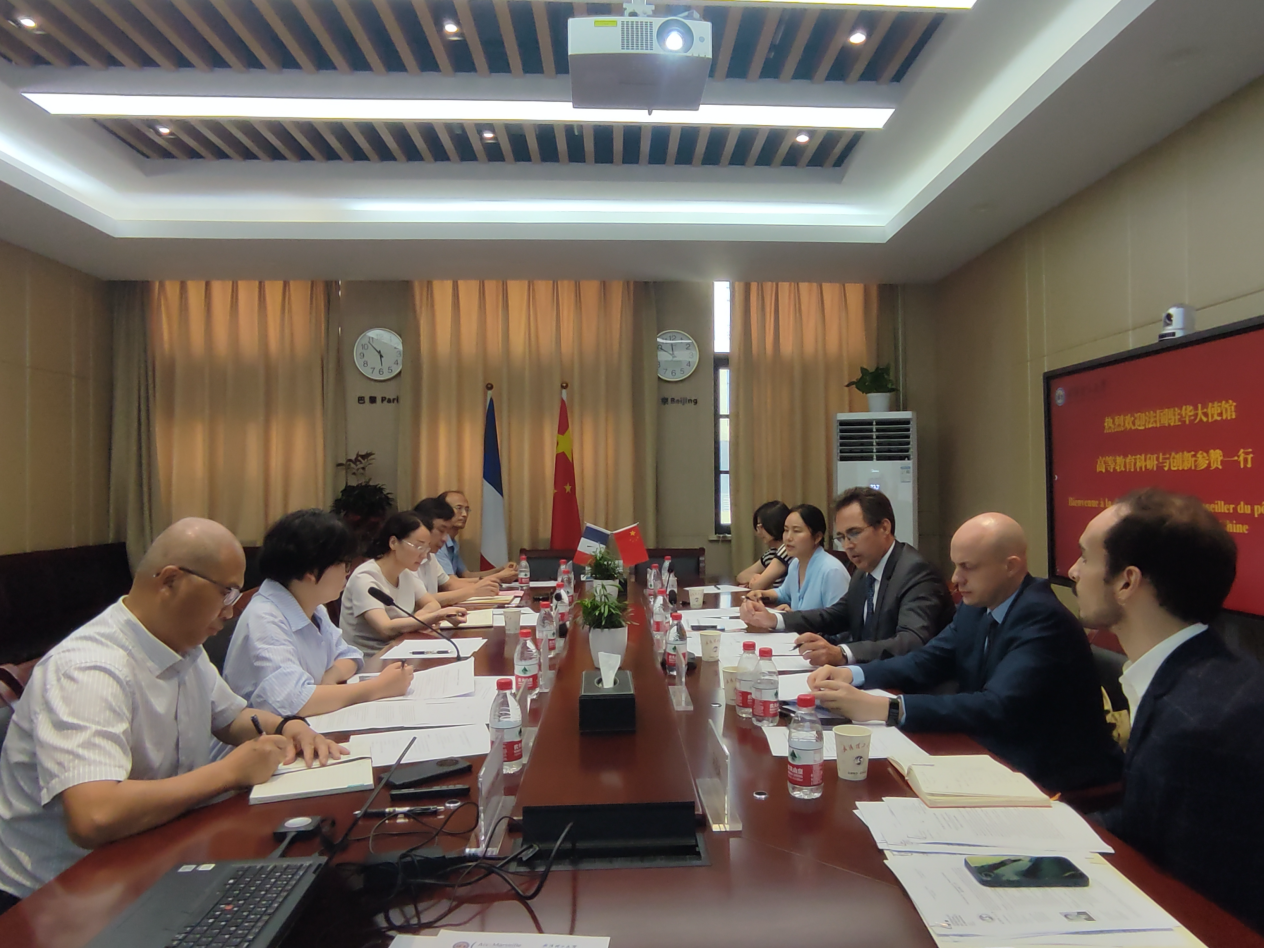 Le jeudi 6 juillet, l'Université de Technologie de Wuhan a accueilli le conseiller de l'Enseignement Supérieur, de la Recherche et de l'Innovation de l'Ambassade de France en Chine, Marc DAUMAS, et la délégation du Consulat général de France à Wuhan à l’Institut WUT-AMU. Les responsables du Service des relations internationales, de la faculté de Chimie, génie chimique et des sciences de la vie, et de l'Institut WUT-AMU ont participé à la réunion, qui a été présidée par XIANG Fan, directrice du Service des relations internationales. Les deux parties ont procédé à des échanges sur la coopération franco-chinoise de l'enseignement supérieur et de la recherche scientifique.